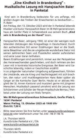 „Eine Kindheit in Brandenburg“ - Musikalische Lesung mit Hansjoachim Baier in Panketal