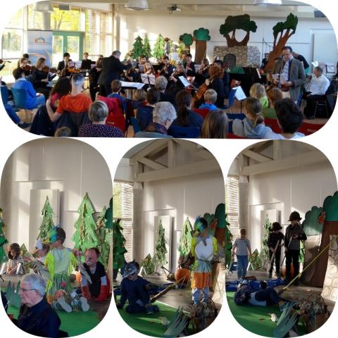 Die „kleinen“ Darsteller auf der Bühne hinter den Musikern illustrierten die Spielhandlung mit Fantasie und Spaß und erweckten das lehrreiche Stück so richtig zum Leben. Ob „Lausbub Peter“, die watschelnde Ente, der flatternde Vogel, die schleichende Katze, ob Großvater mit Stock, verschlagener Wolf oder die ängstlichen Jäger – alle Darsteller überzeugten in den farbenfrohen Kostümen und Masken, welche in wochenlanger Handarbeit von zahlreichen Freiwilligen gefertigt worden waren. Hervorzuheben ist auch das umfangreiche Bühnenbild, bestehend aus zahlreichen Bäumen, Teich, Mauer u.s.w.