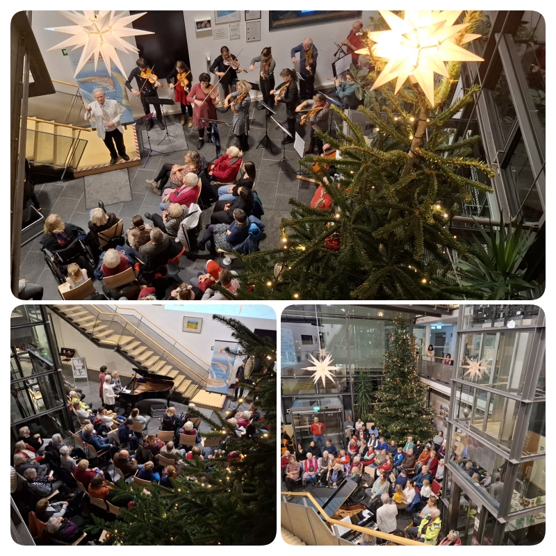 Das Foyer des Rathauses war bis auf den letzten Platz gefüllt. Auch auf den umlaufenden Emporen im ersten und zweiten Stock verfolgten zahlreiche Gäste das Konzertgeschehen. Das musikalische Repertoire spannte einen weiten Bogen: Von beliebten Kinderliedern wie „In der Weihnachtsbäckerei“ über besinnliche Titel wie „Tausend Sterne sind ein Dom“ bis hin zu bekannten DDR-Weihnachtsklassikern wie „Vorfreude, schönste Freude“ und „Sind die Lichter angezündet“ war für alle Generationen etwas dabei.