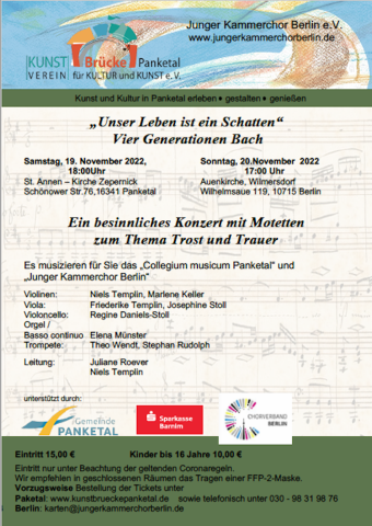 Am Totensonntagswochenende lädt der Junge Kammerchor Berlin gemeinsam mit dem Collegium Musicum Panketal ein zu einem besinnlichen Konzert mit Motetten zum Thema Trost und Trauer von vier Generationen der Familie Bach. Neben J.S. Bachs berühmter Motette „Jesu, meine Freude“ erklingen anrührende Werke seiner Vorfahren Johann Bach und Johann Christoph Bach sowie seines Sohnes Johann Christian.